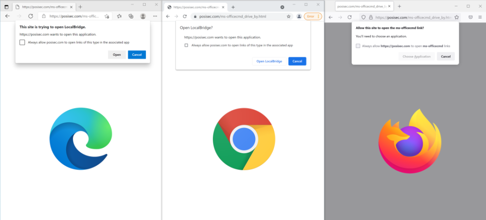 仔细设计的 ms-officecmd: URI 也可以使用进行危险的 URL 处理的桌面应用程序发送。