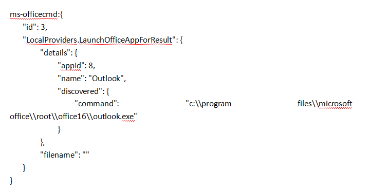使用通过 ms-officecmd: URI 提取的 JSON 载荷打开 Office 桌面程序。 特别是, 从 Office UWP 应用程序提取的载荷可用于启动 Outlook :
