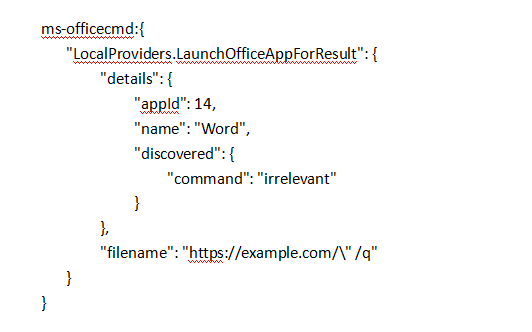 应用程序可使用自定义系统 ms-officeapp 来定义:打开时,它似乎与研究人员ms-officecmd调查的专题极为相似: