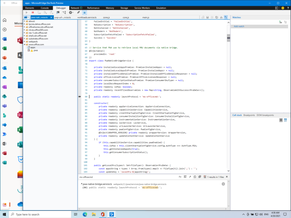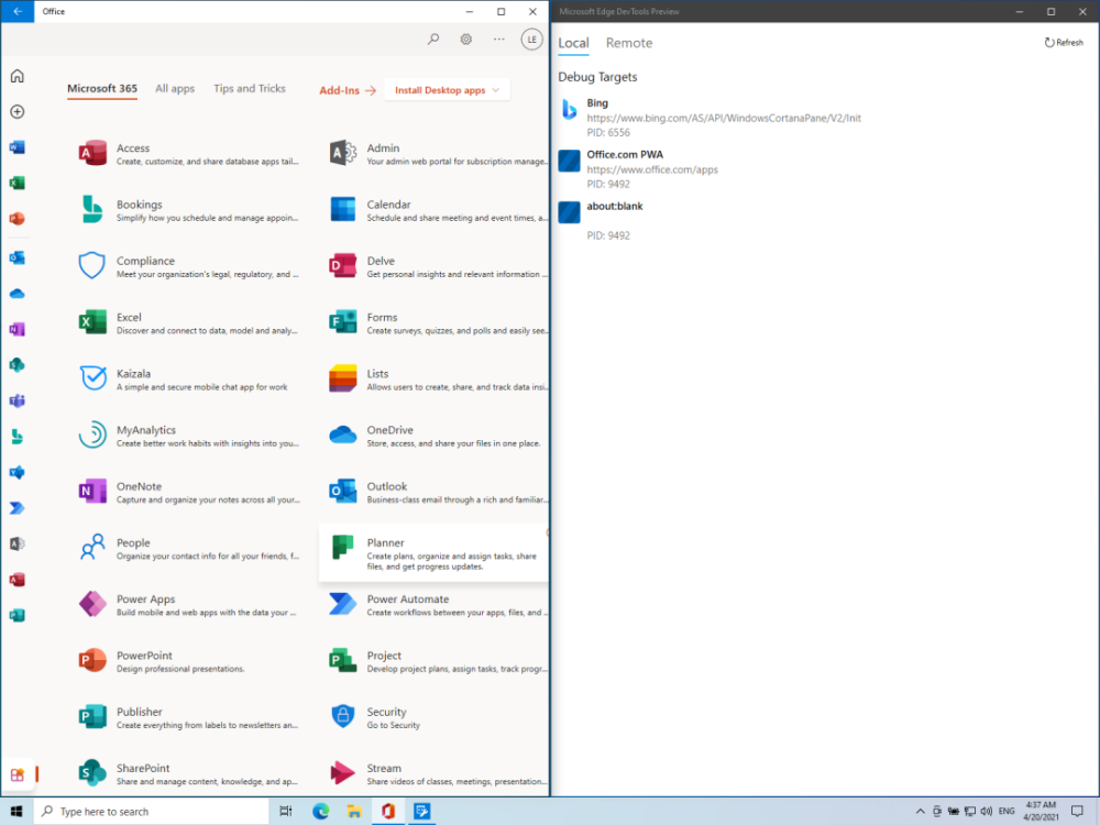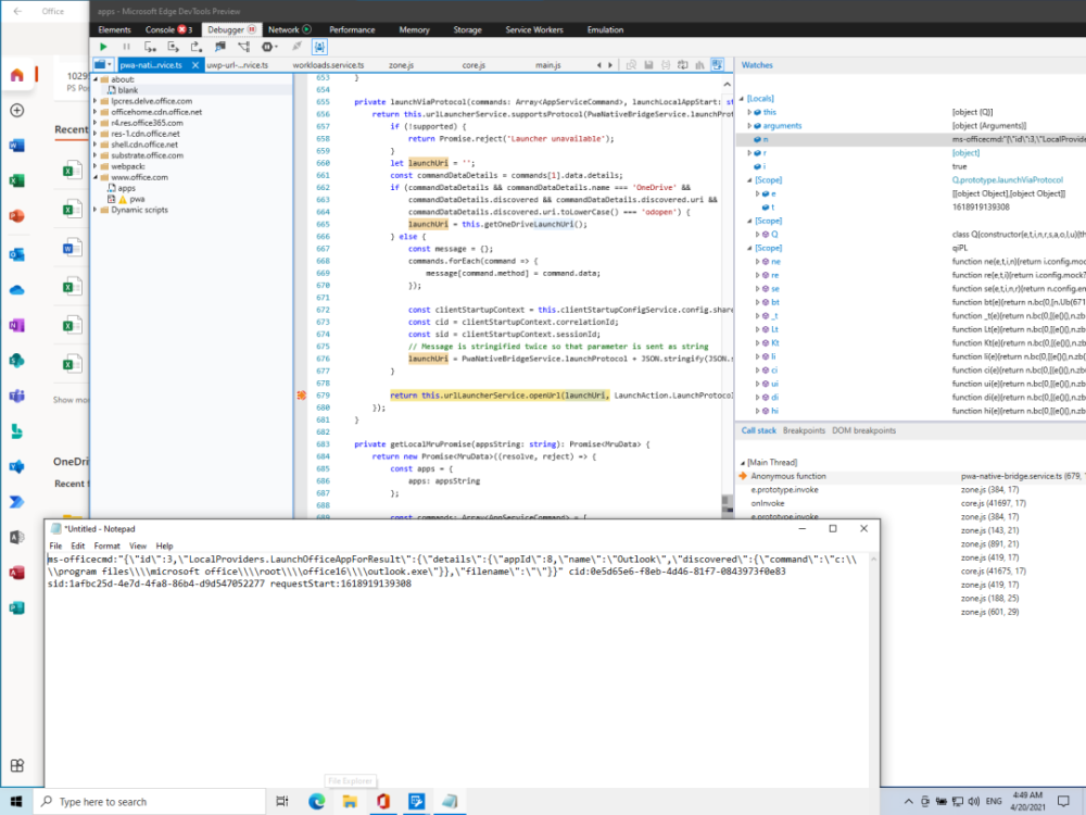 根据经验,当办公室启动办公室桌面程序时,它将能够利用办公室UWP应用程序作为工具。只有在里面,我使用 ms -officecmd: 计划。使用了微软的“Edge DevTools预览”程序。研究人员可以进入该流程,并调试办公室的联合工作方案方案。