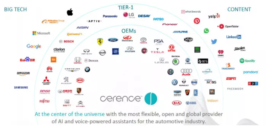 2019年10月 2019年10月 在Cerence与作为独立公开交易公司的Nuance公司分开。证据是一家专门研究自动语音人工智能技术的公司。海洋证券学会声称目前有大约三种语言,使用70多种语言。 2.5亿辆汽车提供服务。其中包括特斯拉、奥迪、宝马、丰田、吉利、乌普夏、福特、通用汽车等。