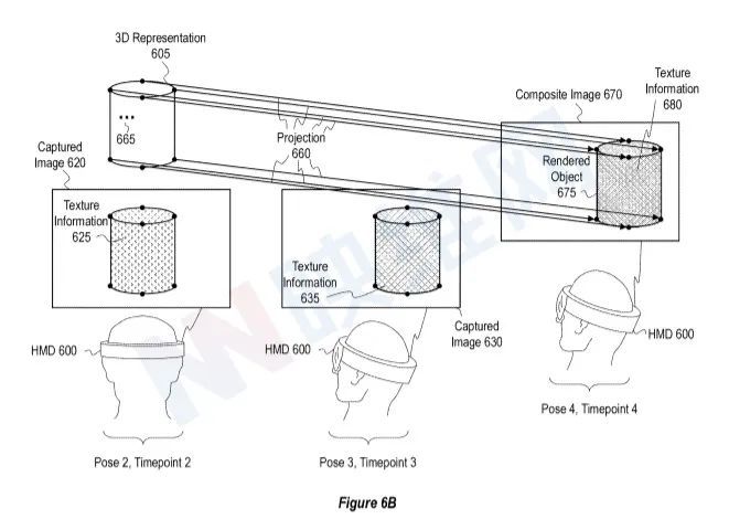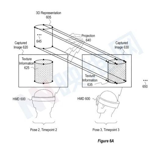 图6A显示当600与第3号阵地连接时发生的情况。补充捕获图630从第3点时拍摄的405个物理物体中的635个头质量为600的附加纹理信息中确定为635个额外纹理信息。在图5C中,时间点3和位置3分别是HMD将以综合图片显示的时间和位置。相比之下,图6A的时间点3和位置3分别涉及在环境中收集的额外捕获照片的时间点和位置。