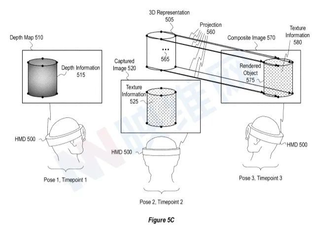 图5C显示570幅综合图象,580条纹理电文代表项目575。如上所述,3D显示,505 3D点中至少有一部分与图片捕捉到的525条纹理信息有关。因此,图5C示出,发给合成图象570575的图象580号图纸信息基于525号图纸信息,该图纸信息与3D点链接,显示预测业务550和560的505个图纸。