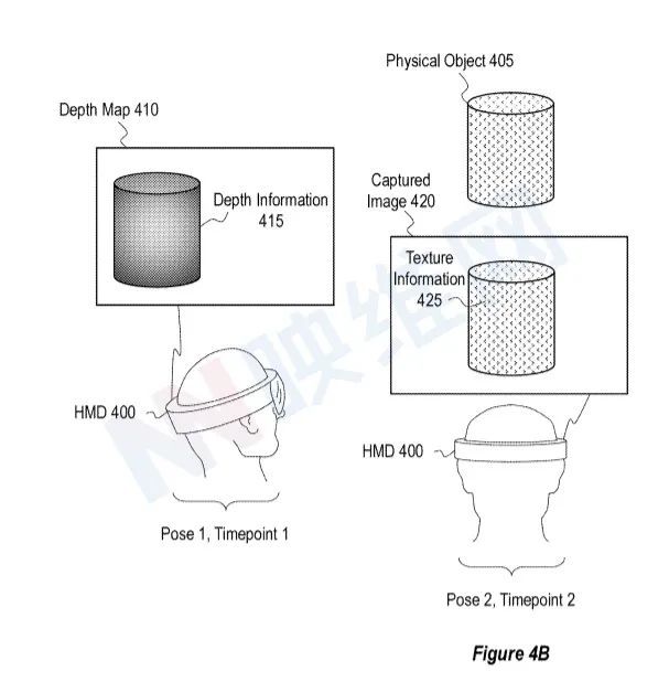 图像420中包含来自405件实际物品的425个纹理资料。从与2号时点2的2号阵地相关的400个头灯的角度来看,425个关于2号时点405个不同表面的实物物品的外观、品质、颜色、一致性等的孔洞信息。如图4B所示,拍摄420张照片的时间在第一个时间点之后的第二个时间点(第2点)发生。另外,图4B显示2点时将400头头挂在第2阵地上。其与姿势1不同。