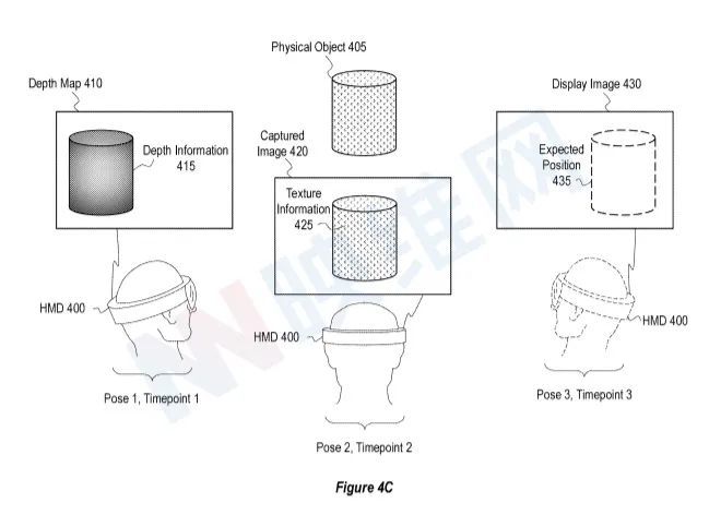图4C显示图像430,显示预期位置为435,用来显示405件实物物品。但作为说明,图4C描述了图430图430图430图420图420图410图410图420图410图4。例如,图4C显示了图430图435的预测位置与图象和深度图410图420图410图420图430图430图4的预测位置之间的差异。例如,深度图410左侧区域410黑410实物物品的405件应用来描述深度。图像420中405的物理物体在图像中间部分详细叙述。它显示图像右手区域图430中的实物物体405的预测位置。