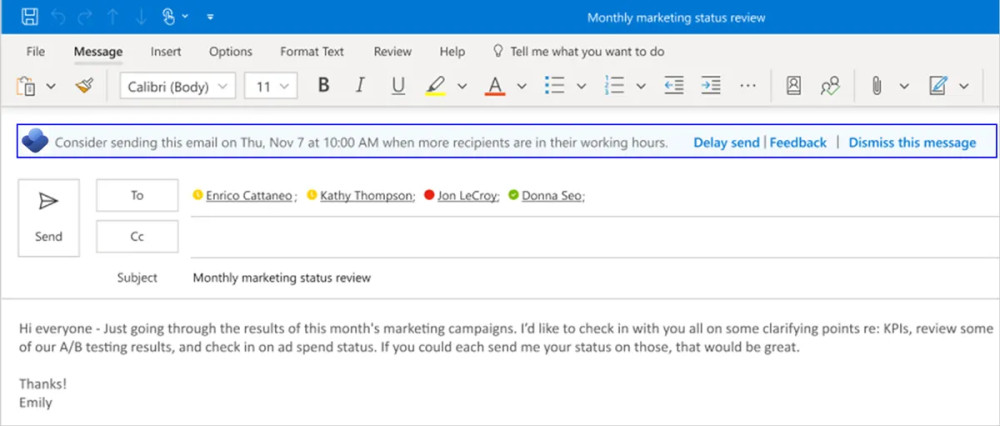 微软Viva Insights and Outlook现在可以向您提出与接收者在不同时区工作时间相一致的电子邮件发送时间安排建议。 延迟有助于减少接收者工作时间以外的干扰。