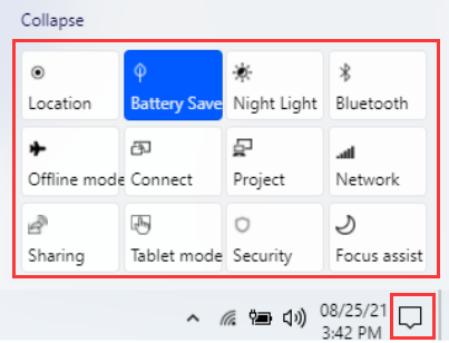 要显示快速开关, 如蓝牙、 Wifi、 位置等, 请单击右下角的通知图标 。