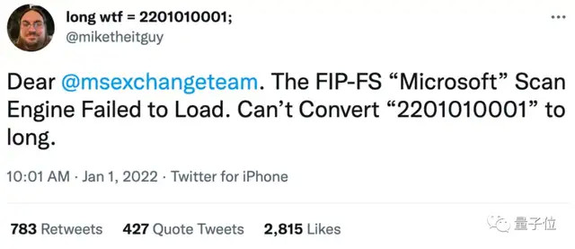 当日期从2021年12月31日改为2022年1月1日之后,许多利用微软交易所的企业发现他们自己写了新年问候信,电子邮件失控。