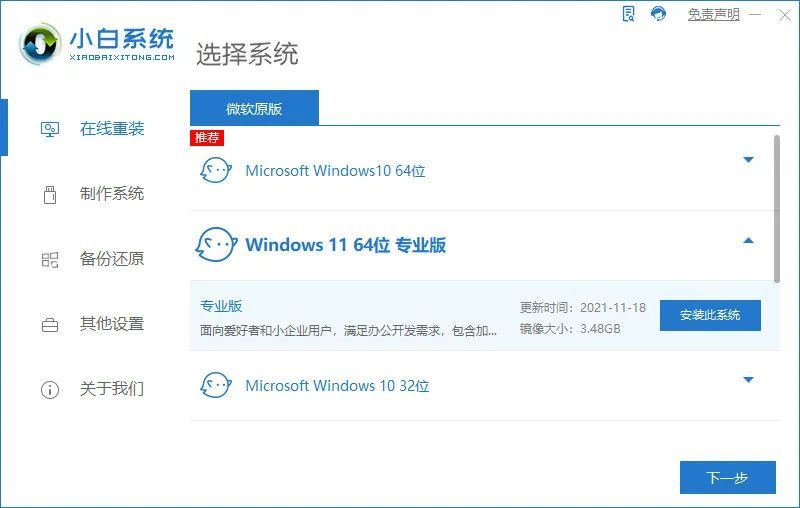 2. 启动小白程序, 定位 Windows 1164 专业版本系统, 然后单击右侧的“ 插入系统” 按钮。 (注: 重新组装系统将格式化 c 盘, 桌面包含重要信息, 应该复制到其他驱动器 。)