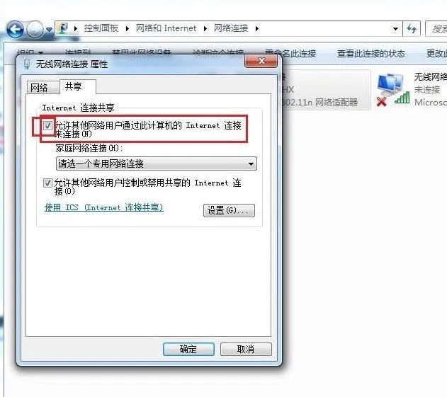 第二阶段是建立一个网络共享中心。单击“ 变化适应器” 按钮 。我们将会注意到一个网络连接,叫做无线网络连接2(如果它已经不存在,我们将能够第一次使用它)。)执行第一步,无线网络连接2,会自动创建),这是Win7提供的虚拟WiFI网络卡。下一步,右键单击您要连接的网络。属性,看看"分享"的标签点击进入,允许更多网络用户使用计算机的互联网连接连接 。然后使用 " 无线网络连接2 " 连接