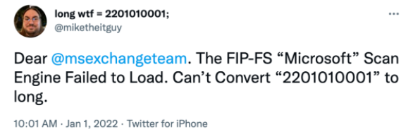 当日期从2021年12月31日改为2022年1月1日之后,许多利用微软交易所的企业发现他们自己写了新年问候信,电子邮件失控。