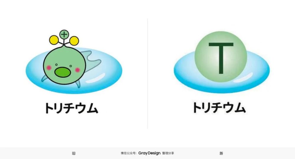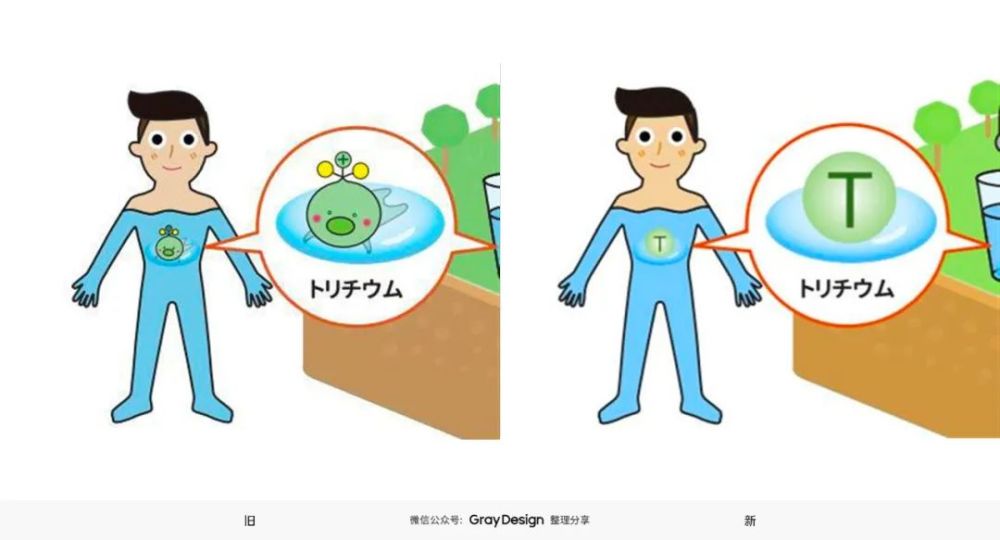 新宣传材料于4月22日重印, 以直截了当的元素符号“T”图形(下图右侧)取代先前广为散发的“辐照”漫画吉祥物。