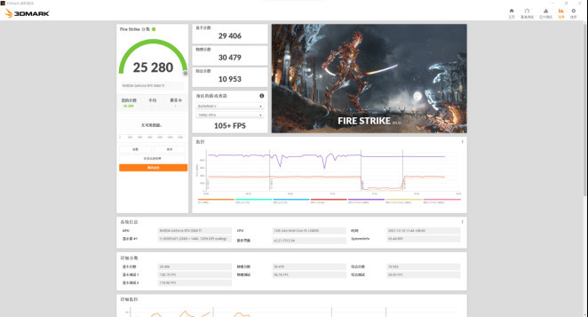 对视觉性能的理论评价采用3D Mark来测试火灾打击和时间间谍项目,火灾打击项目的可见卡分为29406,评估处理器性能的物理分数为30479。