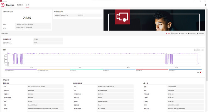 El Procyon的视频编辑基线测试使用Adobe Primee Pro将视频项目文件转换为标准格式。每个视频都有各种编辑、节奏和效果。基本评分由导出视频所需的时间决定。由Kurowii 5-12600 K进行的试验将9 00 2022的完整行程分成7365个部分。视频编辑的性能也相当好。