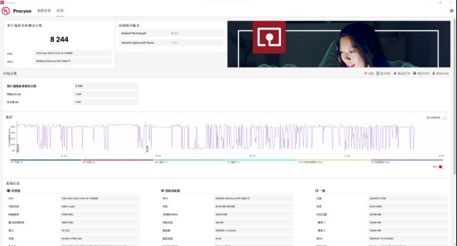 UL Procyon还提供照片编辑基线测试,该测试使用Adobe Photoshop和Adobe Lightroom编辑照片。 Adobe和Adobe Lightroom都预先安装在个人电脑上。它们分别是微调和批量处理。这项实验在许多方面进行。处理器的单向、多两次处理成绩受记忆性能的影响。这项测试中,另一方面,AVRR展示了高水平的图片处理能力。