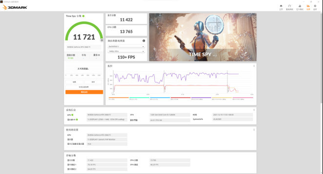 时间间谍项目的关键卡分数为11422分,CPU分数为13765分。