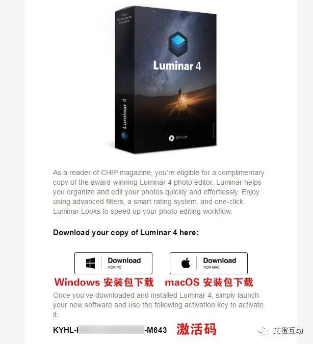 当您打开电子邮件时, 您将会注意到 Luminar 4 的启动代码以及下载地址 。