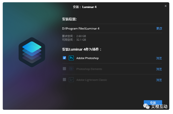Windows 系统被用作例子。 要安装 Luminar 4, 请点击安装软件包 。