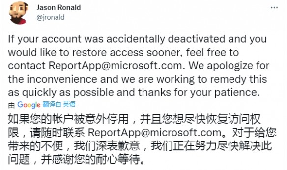 杰森・罗纳德说,个人若无意删除账户,可联系ReportApp@microsoft.com。以加快帐户恢复。"我为这给你带来的任何困难道歉"我们深表歉意,我们正在努力尽快解决这一问题。谢谢你的耐心 我不知道该怎么办