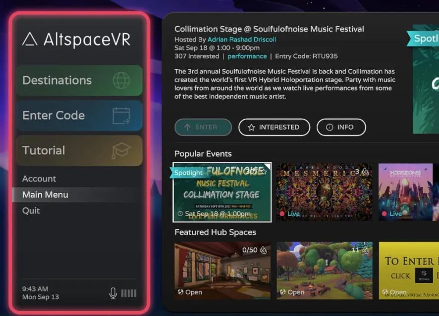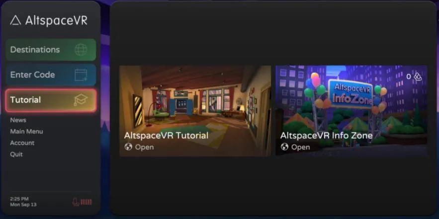 主菜单与 AltspaceVR 的任务控制相类似,因为它便于访问应用程序的所有基本内容和功能。