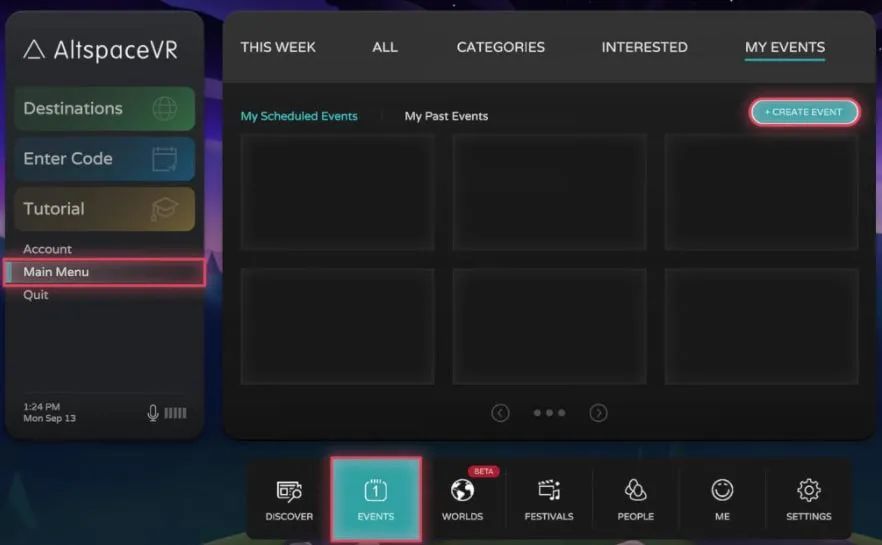 在 AltspaceVR 中,有多种定位活动的方法。 从主菜单, 导航到 :