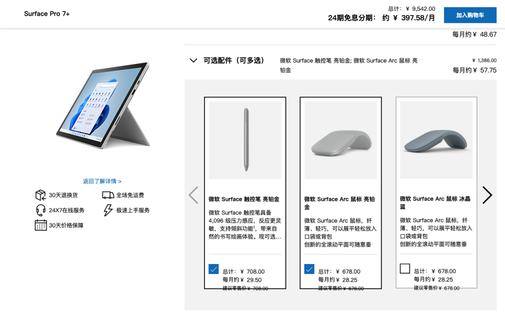 值得一提的是,6288元只包含平板电脑本体,键盘和鼠标需要额外加价选配。小雷发现,适用于Surface Pro 7+的特制键盘需要1168元,鼠标则要678元。考虑到部分用户可能会用来画图,微软还提供了一根708元的触控笔,全套加起来要9542元。