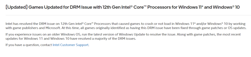 近日,英特尔确认,通过与游戏发行商、微软合作,解决了第 12 代酷睿处理器的游戏崩溃问题,以及无法在 Windows 11 和 / 或 Windows 10 中加载的 DRM 问题。目前,所有被确定为存在此 DRM 问题的游戏都已通过游戏补丁或操作系统更新得到修复。