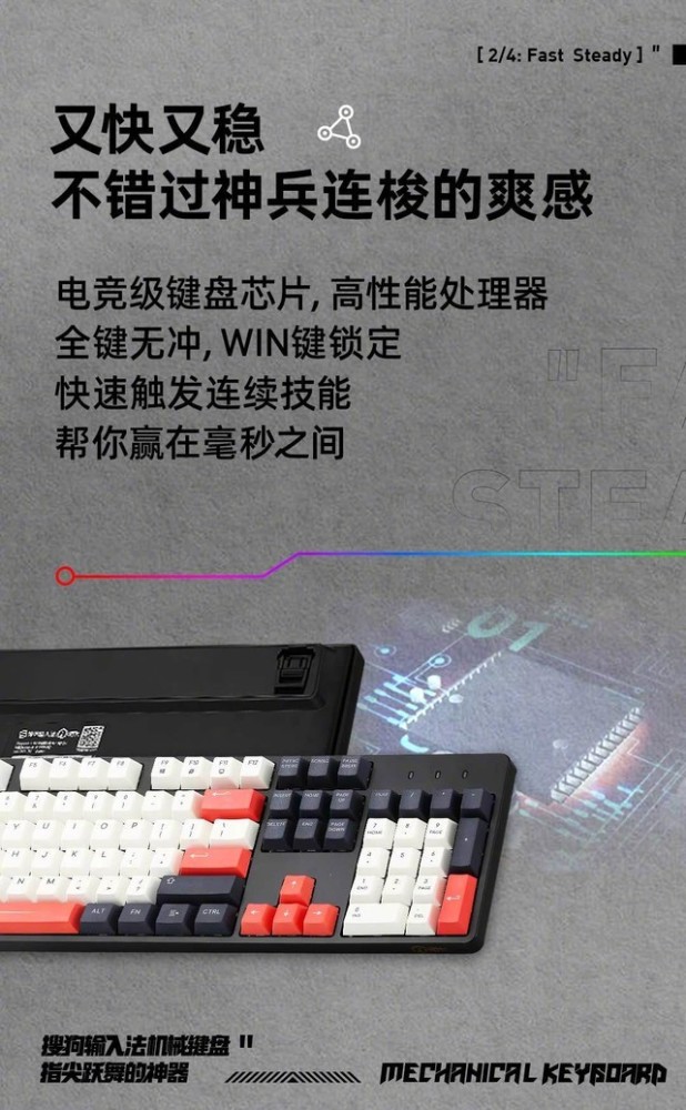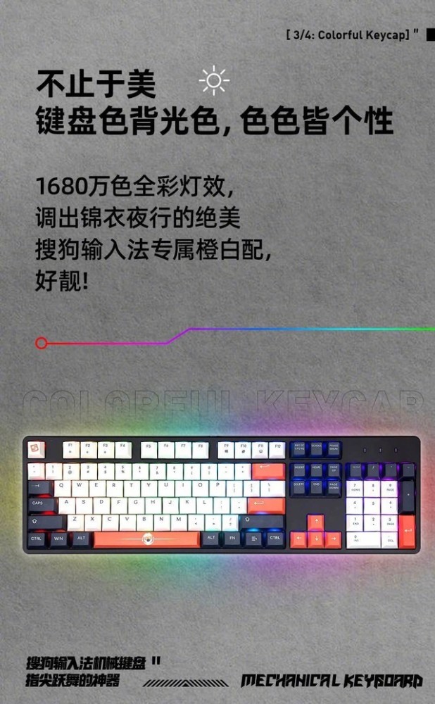 根据官方海报,首款机械键盘键帽采用双色注塑、五面热升华,材质细腻,斜坡和两段式撑脚;键盘采用客制化卫星轴,支持全轴热插拔,配有磁吸上盖,更适合 DIY;电竞级键盘芯片,高性能处理器,全键无冲,WIN 键锁定,快速触发连续技能;1680 万色全彩灯效,有搜狗输入法专属的橙白配色;多功能Type-C键线分离。
