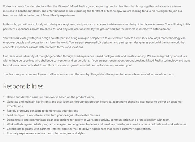 该公司已经公布了Vortex的各种职位空缺,招聘高级设计师和软件工程师。该工作室的高级设计师开幕式表示,它的目标是将探索产品前沿,将合作科学、造福地球的任务和娱乐结合起来,同时推动技术的前沿发展,重点是创建利用HoloLens设备将物理位置带入组合的体验。
