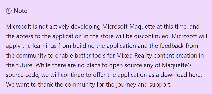 值得一提的是,与谷歌停止维护Tilt Brush时选择开源应用不同,微软表示不会开源Microsoft Maquette,但会继续提供应用的下载。