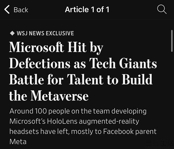 微软AR团队近一年流失近百人,部分跳槽至Meta