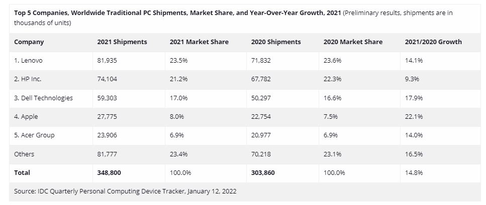 根据IDC的数据,按出货量计算,2021年前五大PC公司分别是:联想(Lenovo),出货量年增14.1%至8190万台;惠普(HP),出货量年增9.3%至7410万台;戴尔(Dell),出货量年增17.9%至5930万台;苹果(Apple),出货量年增22.1%至2780万台;宏(Acer),出货量年增14%至2390万台。