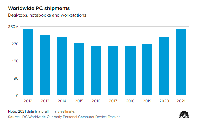 在Covid-19大流行期间,伴随远程工作和学习兴起,人们对电脑的需求升温,从而推动了PC行业的复苏。2021年PC需求激增还一度导致缺货现象出现,尤其是在秋季,当时全球芯片短缺限制了PC供应。