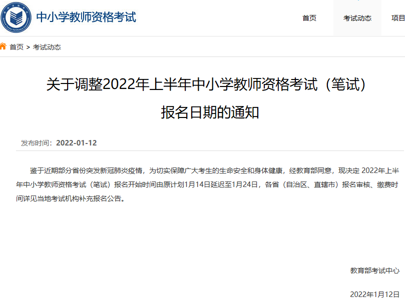 鉴于近期部分省份突发新冠肺炎疫情,为切实保障广大考生的生命安全和身体健康,经教育部同意,现决定 2022年上半年中小学教师资格考试(笔试)报名开始时间由原计划1月14日延迟至1月24日,各省(自治区、直辖市)报名审核、缴费时间详见当地考试机构补充报名公告。