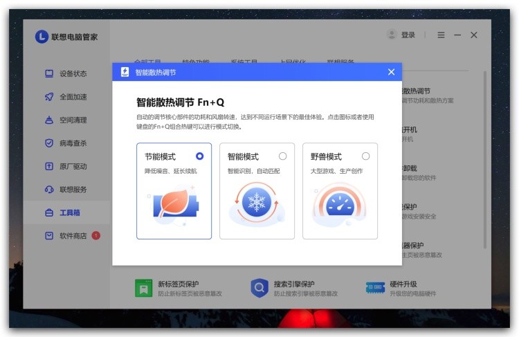 FN+Q提供了三种不同的模式,节能模式、智能模式和野兽模式,节能模式更适合出差办公等场景,能够限制CPU功耗用来提升整机的续航能力。智能模式则是动态平衡功耗、发热和性能,精准把握性能需求,进行更细致的调整。