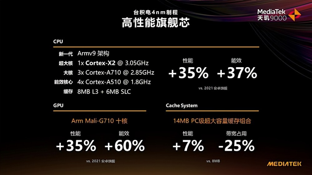 据介绍,天玑9000采用台积电4nm制程,采用新一代Armv9架构,CPU方面内建1颗超大核(Cortex-X2@3.05GHz)、3颗大核(Cortex-A710@2.85GHz)、4颗能效核心(Cortex-A510@1.8GHz),8MB L3缓存+6MB SLC。
