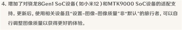 日志显示,更新后, 使用相关设备且“设置-图像-图像质量”非“默认”的旅行者,可以自行调整图像质量以获得更好的体验。