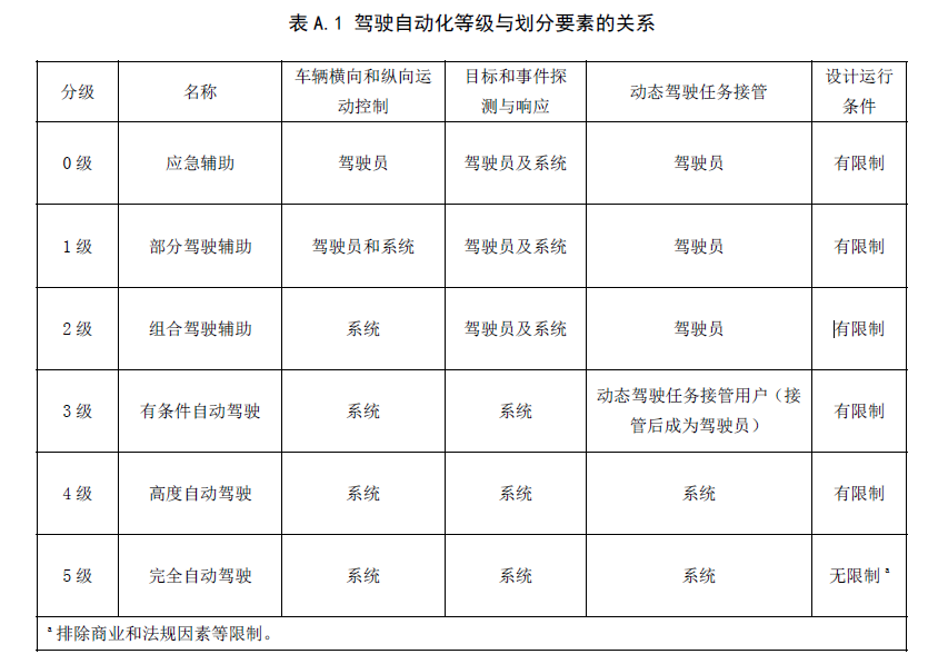 2021年8月19日,由全国汽车标准化技术委员会组织国内外十余家汽车企业、历时3年共同编制的《汽车驾驶自动化分级》标准正式发布,该标准清晰的定义了从应急辅助、部分驾驶辅助、组合驾驶辅助、有条件自动驾驶、高度自动驾驶到完全自动驾驶的6个级别,将于2022年3月1日正式开始实施。