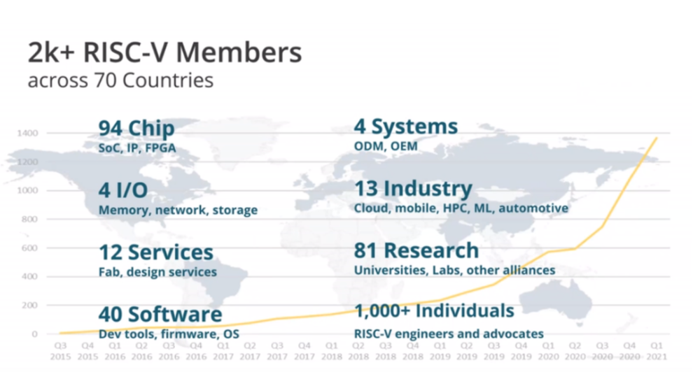 截至2021年12月,RISC-V International 企业成员来自70多个国家,企业成员数量增长至2000多家,与2015年初创时相比增长了50多倍。