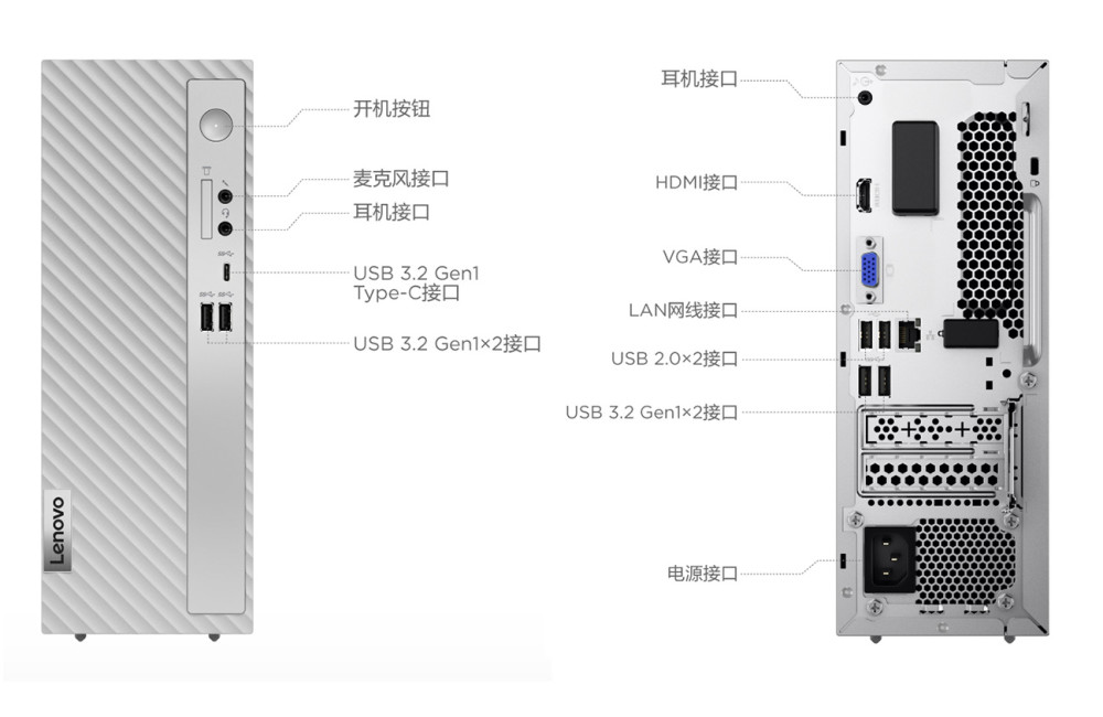 前置接口上有一个Type-C,一个USB 3.2,还有两个USB 2.0,比较简洁。后置接口有DP 1.4,HDMI,方便连接最新的显示器。提供三年上门服务。