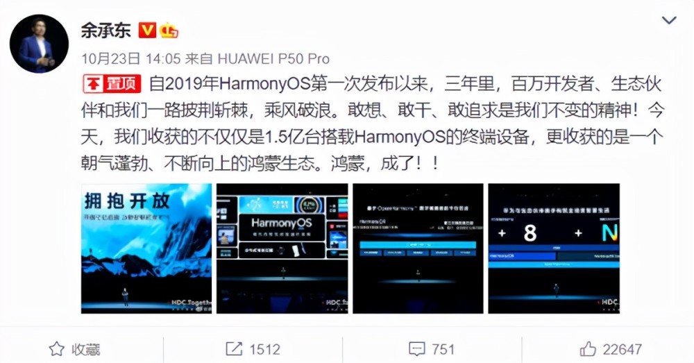 在三星放弃Tizen之后,华为自研的鸿蒙系统就变成了“独苗”。在去年10月份,鸿蒙升级设备超过1.5亿台,华为消费者业务CEO余承东激动的在其微博上表示:鸿蒙,成了!!