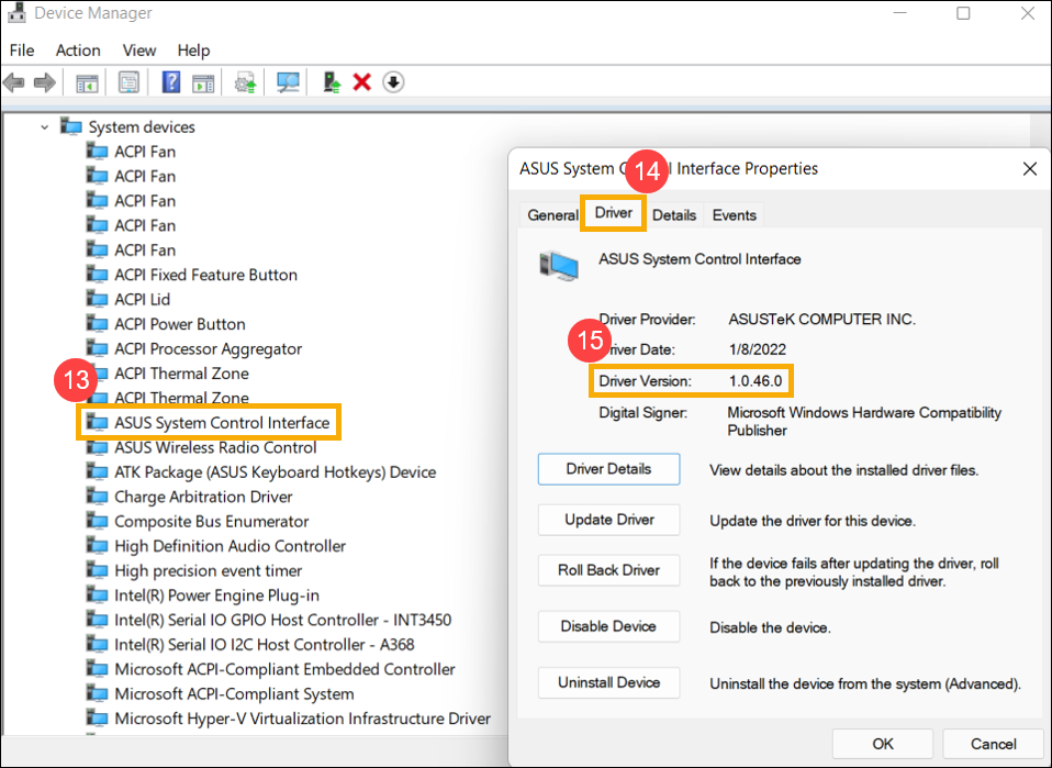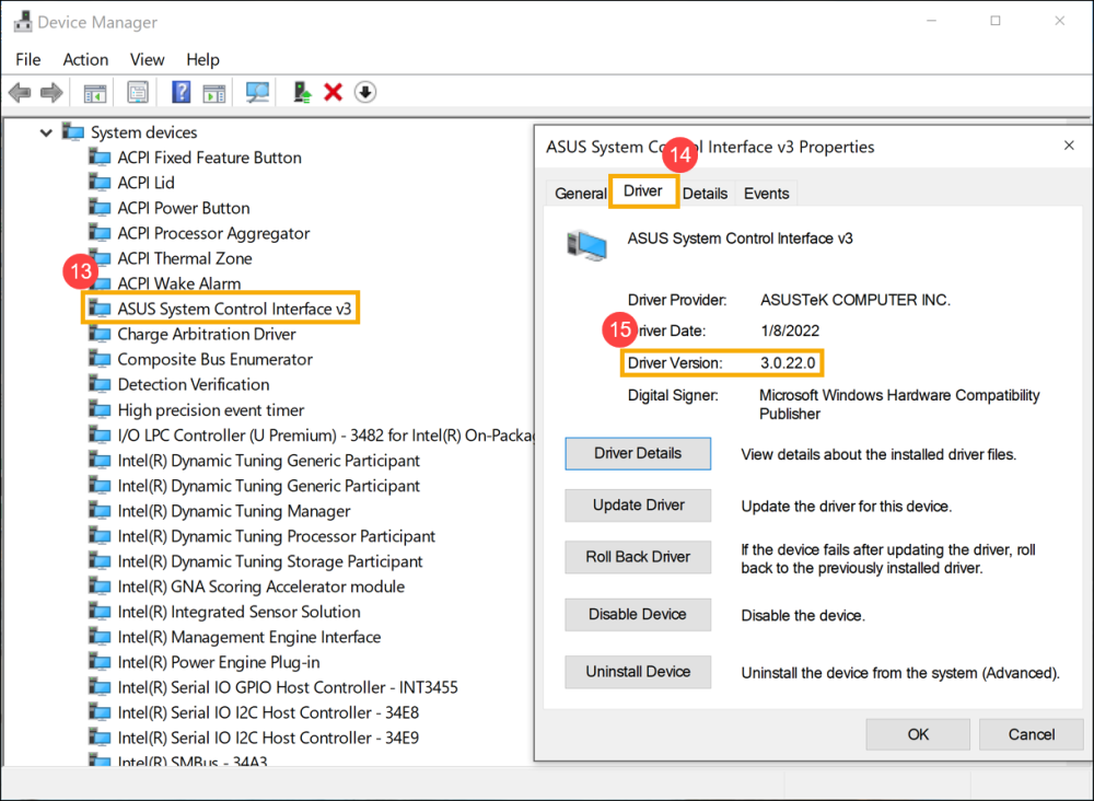 在系统设备类别中,双击 [ASUS System Control Interface] ,然后选择 [Driver] 选项卡查看 [Driver Version] 。