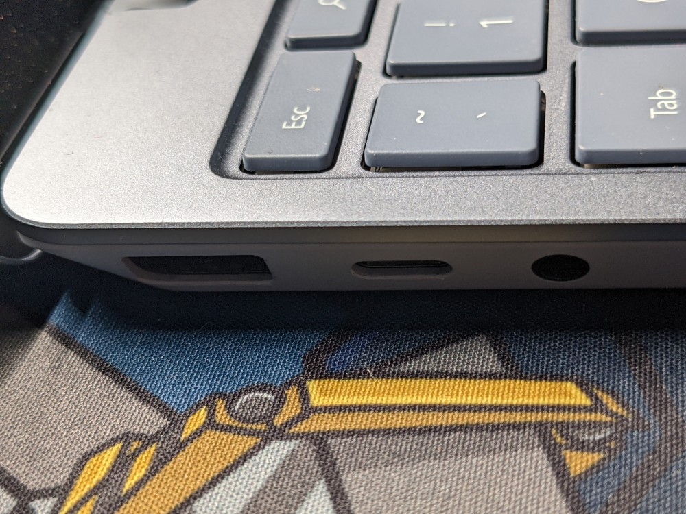 紧凑的设计并非没有代价。Surface Laptop Go 整个机身只有 4 个接口:左边是一个 USB-C、一个 USB-A,以及一个 3.5mm 耳机插孔;右侧只有 Surface Connector 充电口,I/O 拓展性确实成问题。不仅如此,为了使机身看起来更为紧凑,这些端口所在的侧边并非垂直,而是向里有一个倾斜度,使得 USB 配件的插入有些困难,Surface Connector 也难以一下子接上。