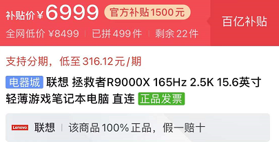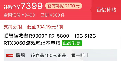 而在第三方店铺和平台,R9000X的售价从发售到十一月份都普遍保持在9000-1000之间,现在则是只要6999就能买到现货的全新品,降价幅度接近30%。除了R9000X之外,热销的R9000P同样也降价许多,在拼多多的百亿补贴平台上仅需7299元即可入手,而在2021年的12月中旬,R9000P的京东售价还一度高达8999元,降价幅度接近20%。