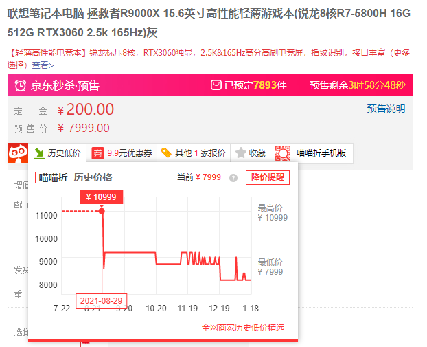 甚至仅仅在一个月前,想要买到一台没有溢价的游戏本都不算轻松,在双十一的时候更是需要抢购,手慢一点就是直接售罄。再看看现在,R9000P正在京东自营以7999元的官方发售价接受预定,预定数量截止至小雷撰稿的时候已经达到7560件,即使如此支付定金的按钮依然明亮,显然是货源充足。