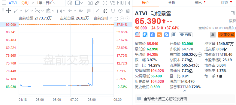 消息后,动视暴雪美股盘前拉升,涨近40%。