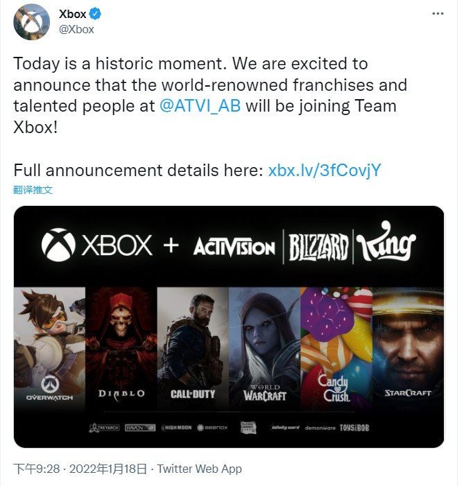 - 2022-01-19 豪掷4364亿!微软收购《魔兽》开发
