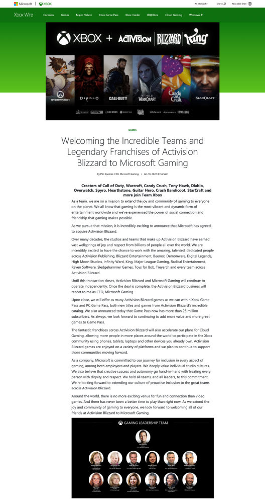 在当地时间2022年1月18日上午5:25,微软游戏Microsoft Gaming首席执行官Phil Spencer宣布动视暴雪加入微软大家庭,其中包括动视及暴雪的一众游戏IP的创作者加入Xbox的团队中。